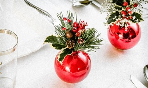 Retire a argola da bola, coloque os ramos de pinheiro, arteficiais ou naturais, coloque a argola de cortinado na mesa e coloque a bola sobre a mesma.