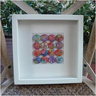 | Utilizei botões forrados a tecido, mas pode colocar outro género de botões ou até mesmo outro tipo de objetos. Aplique os botões com cola quente numa folha da dimensão da moldura. Já sabe, dê asas à sua imaginação. Divirta-se! |