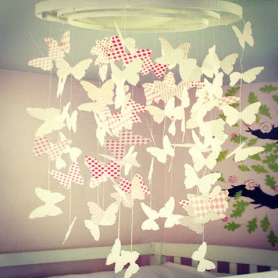 | Borboletas de papel penduradas no candeeiro do quarto, transformam o quarto, num espaço saído de uma fábula. |