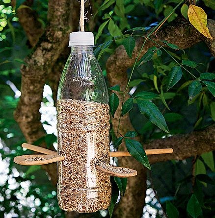 1. Faça alguns furos na garrafa e na tampa. 2. Na tampa coloque o fio dando um nó na ponta que vai suster a mesma, a outra extremidade vai fixar numa árvore ou em qualquer outro ponto de fixação. 3. Coloque a alpista dentro da garrafa. 4. Insira as colheres de madeira.